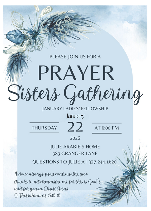 This month's Ladies' Fellowship will be a Prayer Sisters Gathering at Julie Arabie's Home on January 22nd at 6:00pm. I hope you will join us for fellowship and prayer. Moving forward Prayer Sisters will look different, but will still be the same. I will share some of the changes as well as have soup, salad and dessert. I pray you will join us if you are able. ❄️